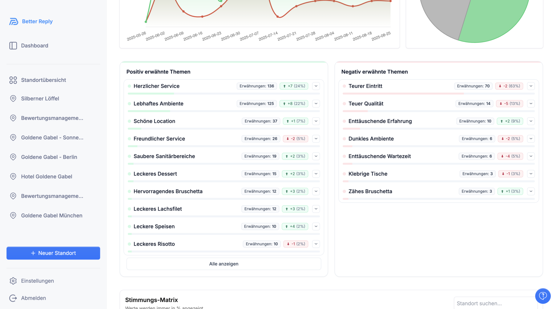 - Vergleich einzelner Standorte in der Stimmungs-Matrix (z. B. Service, Ambiente, Preis)