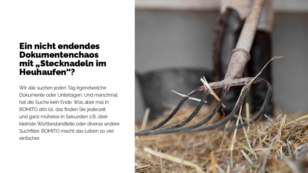 Wir alle suchen jeden Tag irgendwelche Dokumente oder Unterlagen. Und manchmal hat die Suche kein Ende. Was aber mal in BOMITO drin ist, das finden Sie jederzeit und ganz mühelos in Sekunden z.B. über kleinste Wortbestandteile oder diverse andere Suchfilter. BOMITO macht das Leben so viel einfacher.