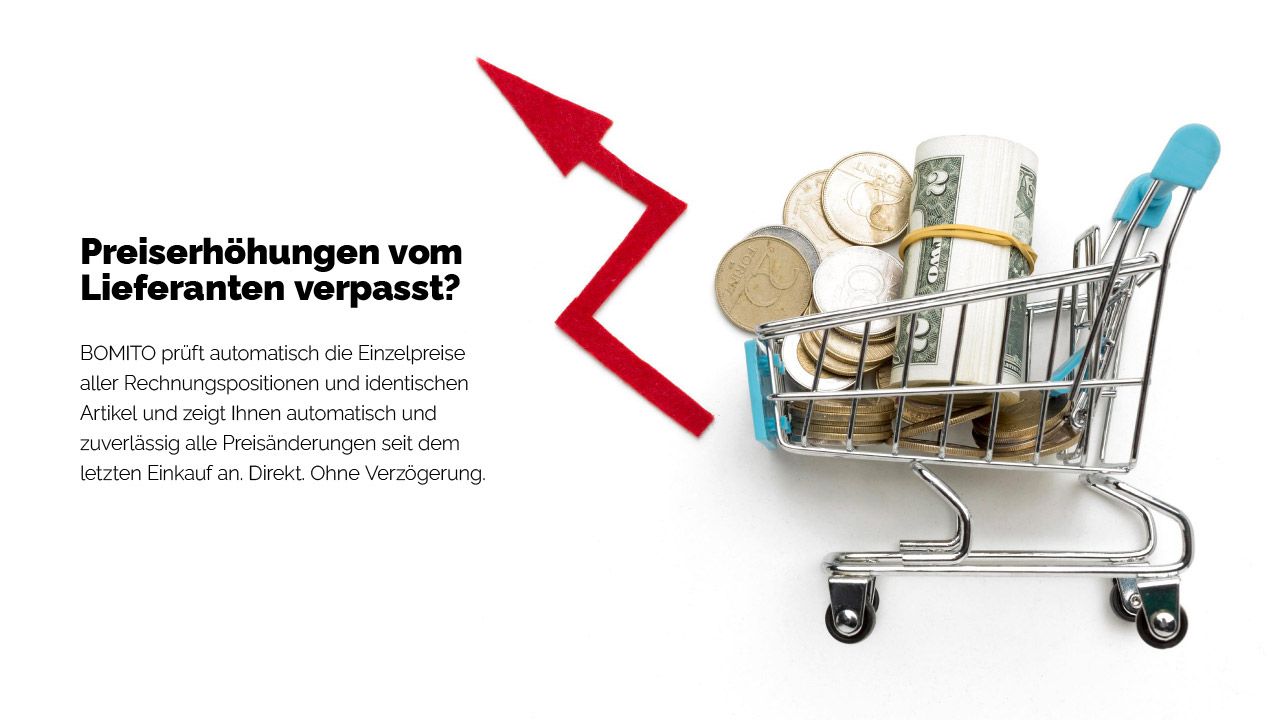 BOMITO prüft automatisch die Einzelpreise aller Rechnungspositionen und identischen Artikel und zeigt Ihnen automatisch und zuverlässig alle Preisänderungen seit dem letzten Einkauf an. Direkt. Ohne Verzögerung.