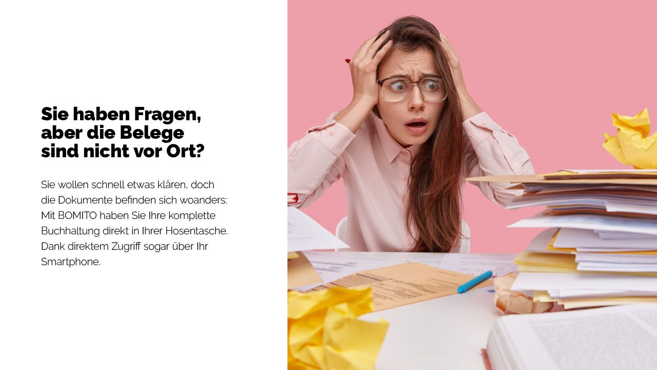 Sie wollen schnell etwas klären, doch die Dokumente befinden sich woanders: Mit BOMITO haben Sie Ihre komplette Buchhaltung direkt in Ihrer Hosentasche. Dank direktem Zugriff sogar über Ihr Smartphone.